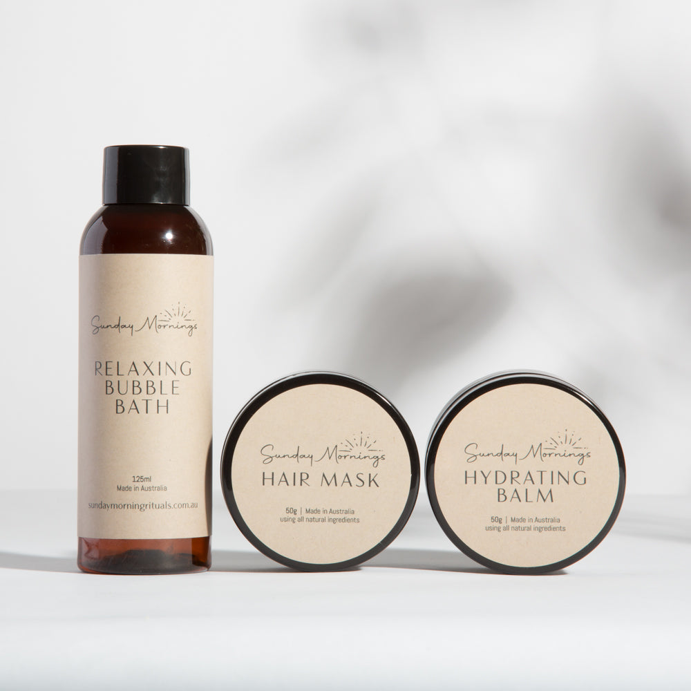 Take a moment to unwind and indulge in self-care with our Peaceful Pause Ritual Pack. This luxurious trio is designed to soothe your senses and nourish your skin from head to toe, offering the ultimate relaxation experience. Escape into a world of tranquility with a calming bubble bath, then pamper your skin with a deeply moisturising hydrating balm that locks in moisture and restores your natural glow. Finish your ritual by treating your hair to an enriching mask that hydrates, repairs, and revitalizes for a healthy, glossy finish. The Peaceful Pause Ritual Pack is the perfect way to slow down, rejuvenate, and treat yourself to some well-deserved "me time." Embrace peace and nourish your body with this thoughtful self-care bundle.