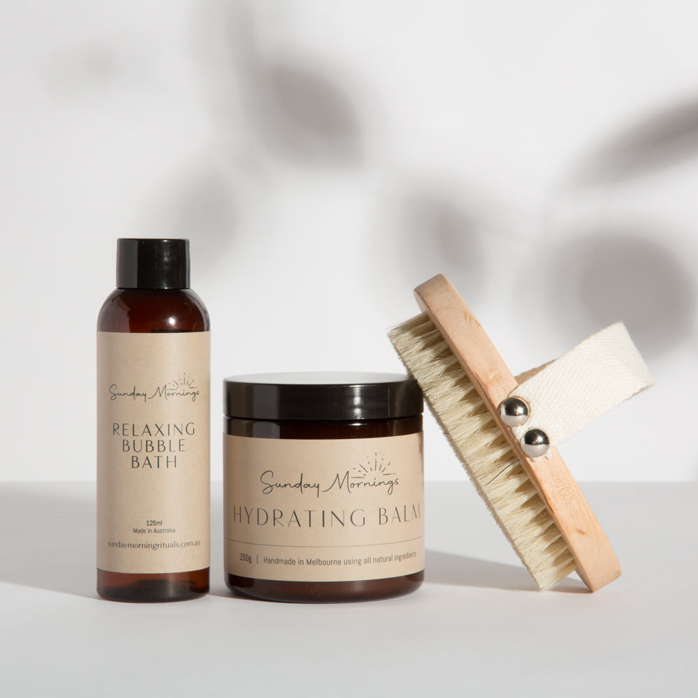 Rejuvenate your body and mind with our Recharge and Renew Ritual Pack. This revitalising trio is designed to refresh your senses, nourish your skin, and promote relaxation. Begin by using the small body brush to gently exfoliate and stimulate blood circulation, preparing your skin for a deeply restorative experience. Then, immerse yourself in a soothing bubble bath, letting the day’s stress melt away. Finish your ritual by applying our rich hydrating balm, leaving your skin soft, moisturised, and glowing. The Recharge and Renew Ritual Pack is the perfect way to revive your energy and indulge in a moment of self-care.